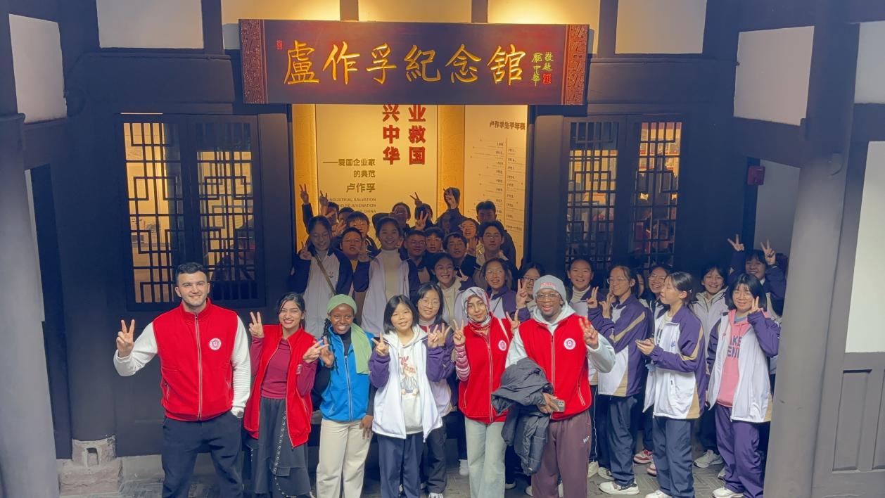 活动伊始,留学生们在卢作孚纪念馆集合,身着统一的活动服装,开启了一段跨越时空的文化之旅。纪念馆内,讲解员详细讲述了卢作孚先生在乡村建设中的伟大实践与无私奉献精神,激励学生们深入思考乡村振兴的历史根基。在馆内外寻找卡片的趣味环节中,大家通力合作,以答题促新知,进一步加深了对中国乡村建设早期探索的认识,心中的敬意油然而生。
