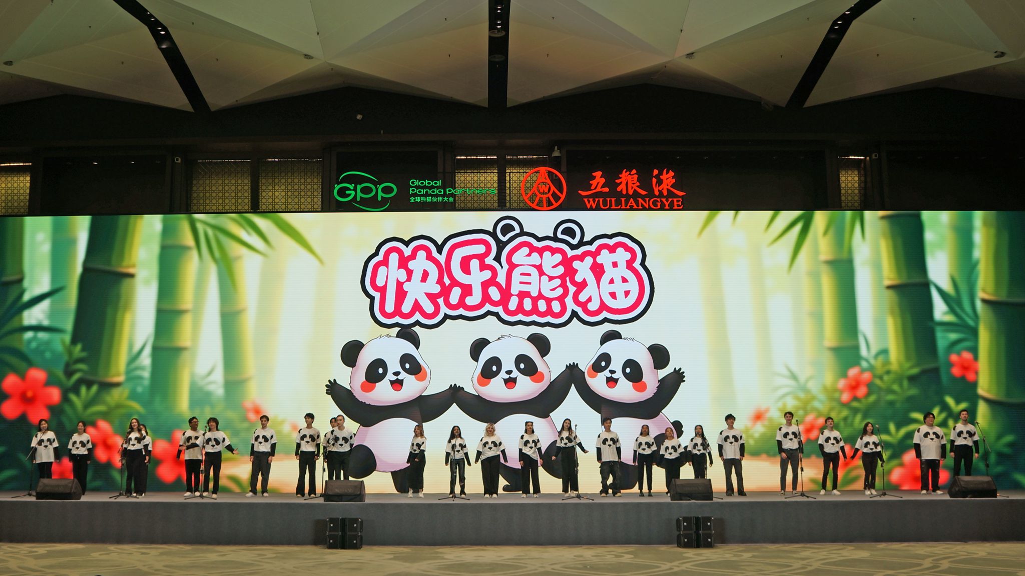 大会晚宴上,合唱团倾情演绎了原创歌曲《快乐熊猫》。这首歌曲以欢快的旋律和生动的歌词,描绘了大熊猫在自然环境中的自由生活与无忧无虑。同时,歌词中也蕴含了对生态保护重要性的深刻认识。留学生们身着特制的熊猫服装,将现场氛围推向了高潮,赢得了与会者的热烈掌声。他们的表演以音乐为桥梁,向全球传递了生态保护的重要性。