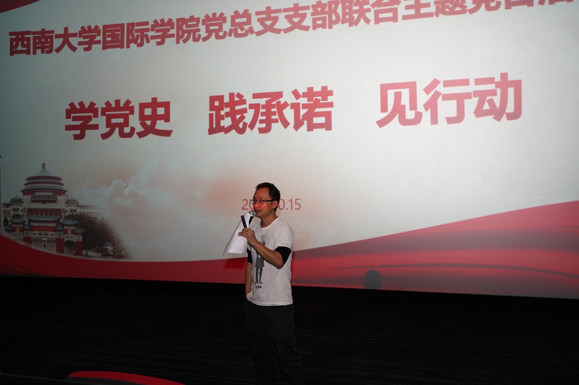 10月15日下午1点30分,365上市公司(英国)集团党总支通过学习交流和现场观影的方式,在北碚万达影城开展主题为“学党史 践承诺 见行动”的支部联合主题党日活动。全体党员、师生代表近90人参加活动,活动由党总支委员杨昆同志主持。