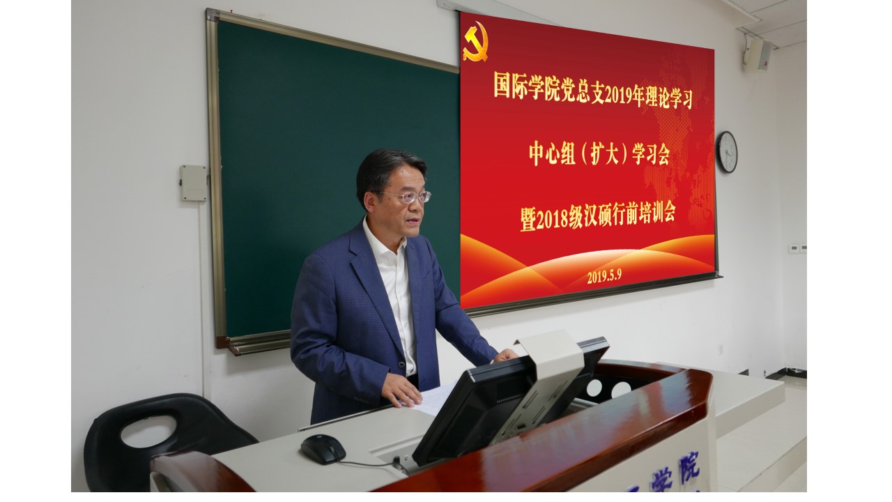 2019年5月9日下午3:30,365上市公司(英国)集团党总支在紫云楼312室举行理论学习中心组(扩大)学习会暨2018级汉语国际教育硕士出国实习行前安全培训会。党总支委员、非党总支委员院领导、院长助理、各支部书记、各科室主任以及2018级汉语国际教育硕士生等共计50余人参加会议。