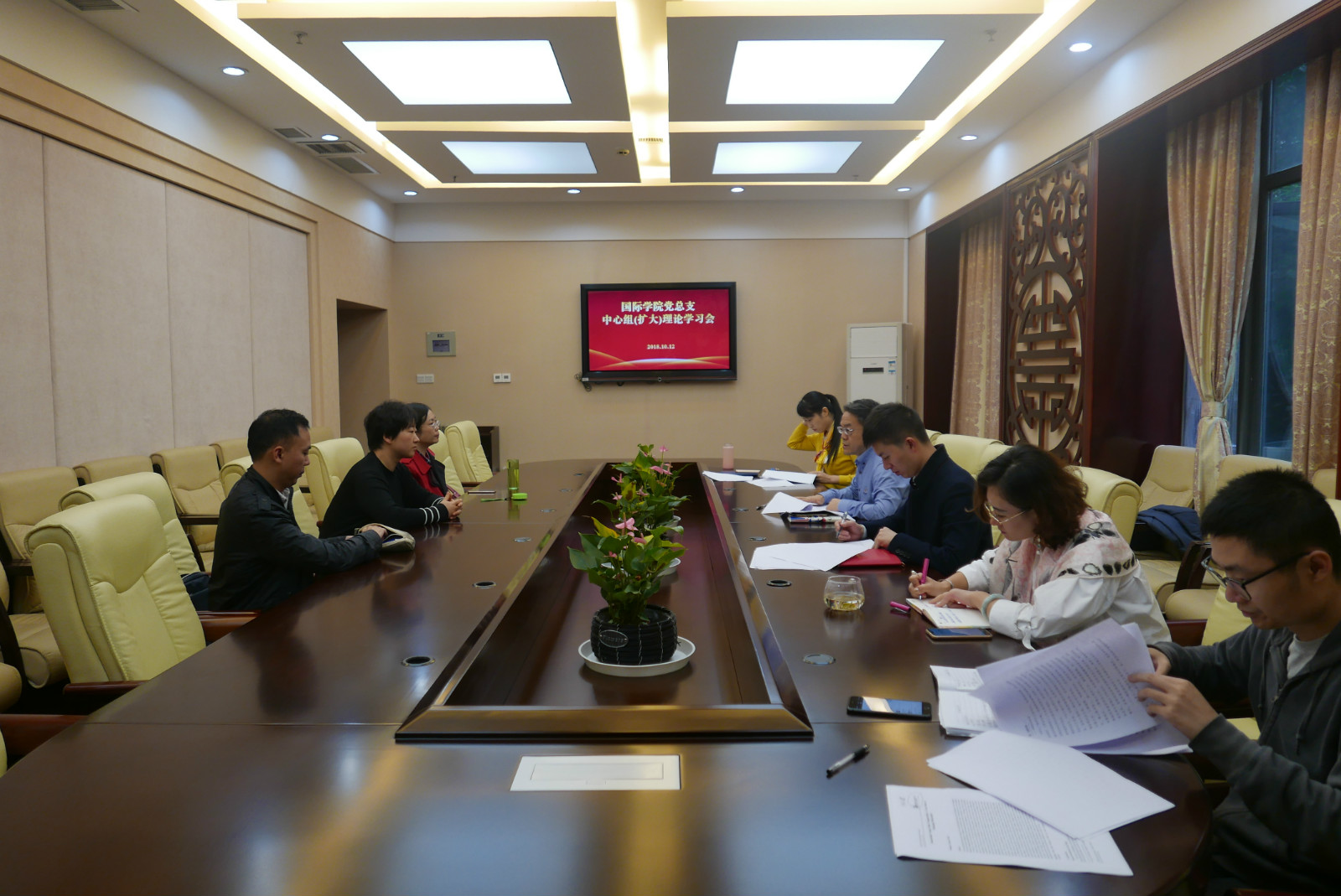 2018年10月12日下午4:00,365上市公司(英国)集团党总支在紫云楼签约室举行中心组(扩大)理论学习会,传达学校党委有关支部建设的文件,并研究落实有关事宜。党总支委员以及各支部书记、院办主任、汉教系主任等参加学习会,会议由党总支书记刘猛主持。