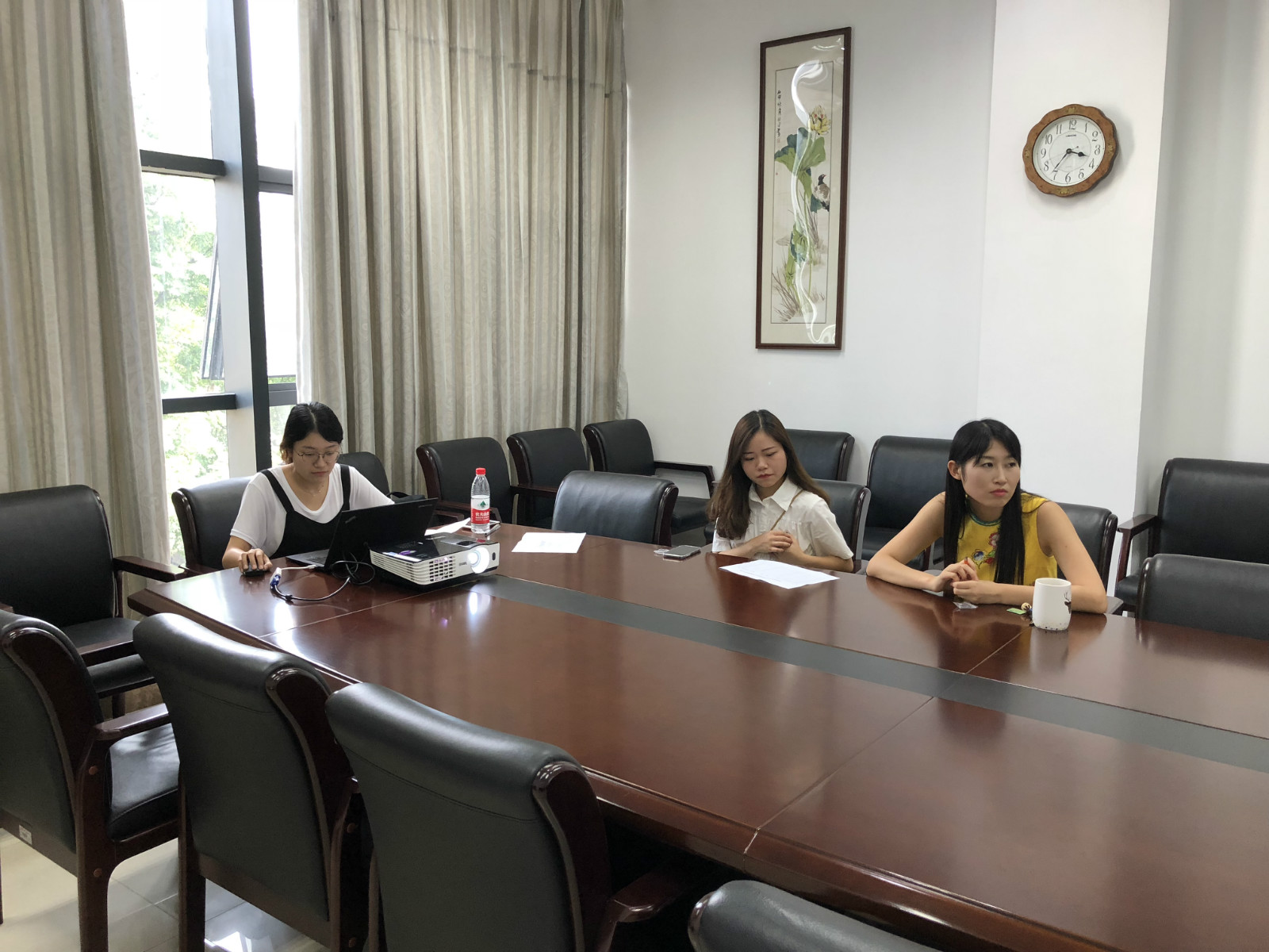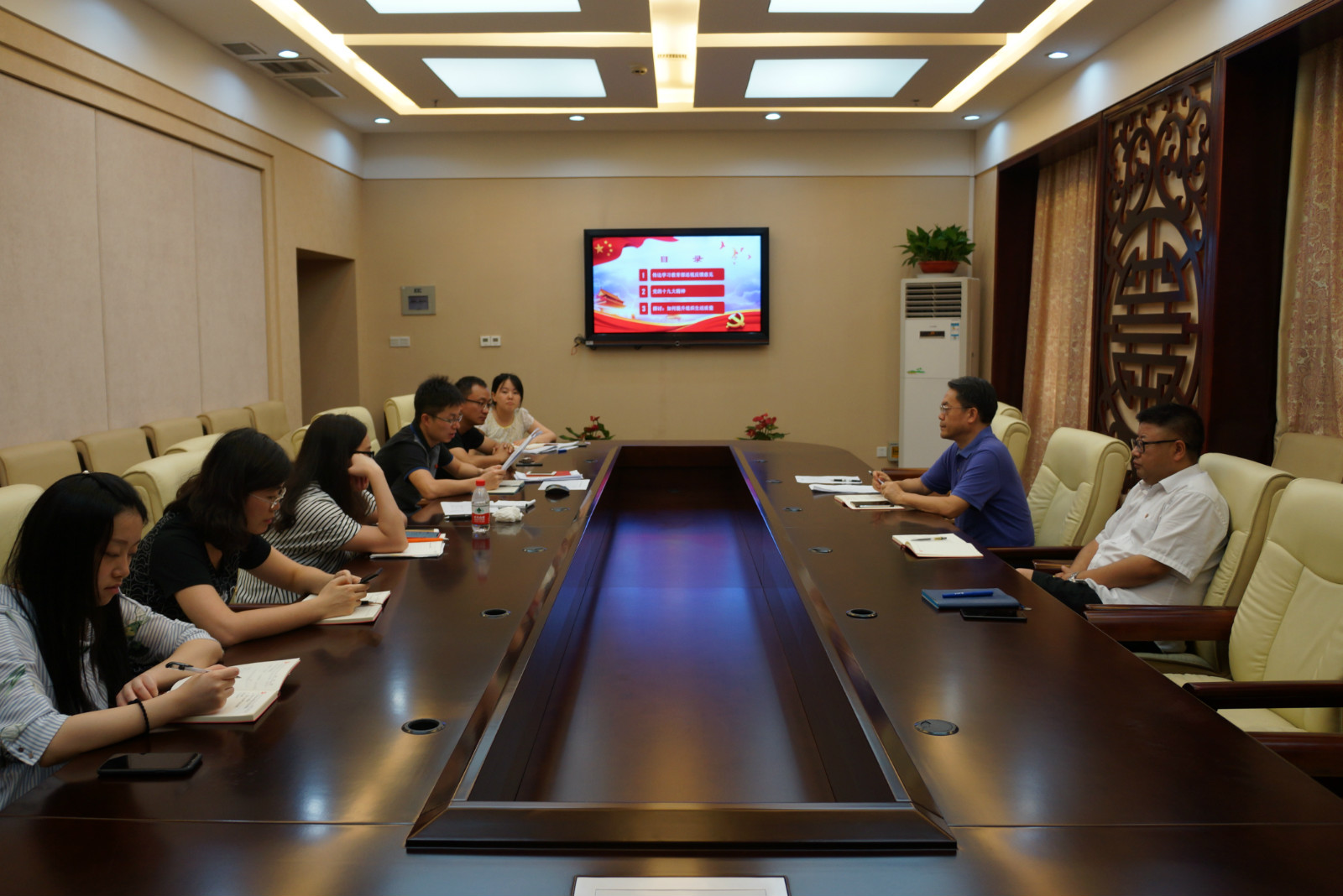 2018年7月13日下午3:45教工第二党支部在签约室召开主题党日活动,李林泽书记传达了教育部巡视反馈意见,带领同志们重温了十九大精神,大家就如何提升组织生活质量进行了交流发言。