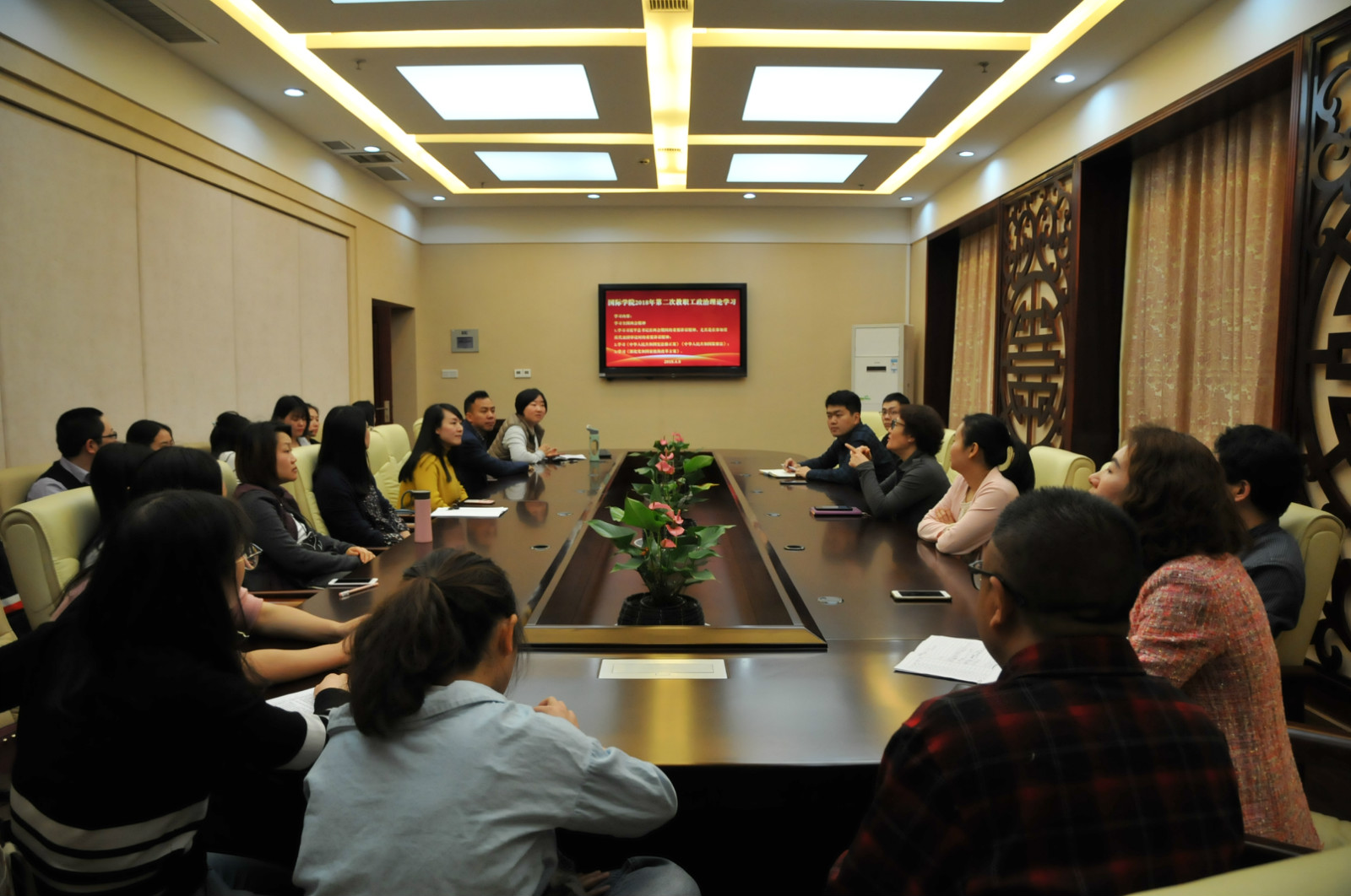 2018年4月8日下午3:00,365上市公司(英国)集团全体教职工在紫云楼一楼签约室开展2018年第二次政治理论学习活动,会议由王静院长主持,范媛媛老师主讲。