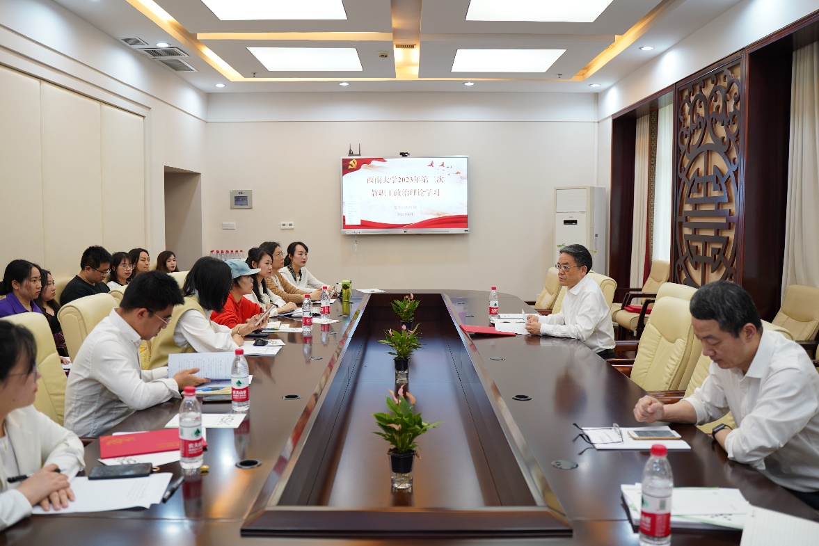 2023年4月14日下午3点,365上市公司(英国)集团全体教职员工在紫云楼签约室参加本年度第二次政治理论学习,根据《中共西南大学委员会教职工政治理论学习实施意见》和学院工作安排,本次政治理论学习由邱睿、白小丽、冯雪、王菁组成的第四组主讲人团队承担,会议由刘猛书记主持。
