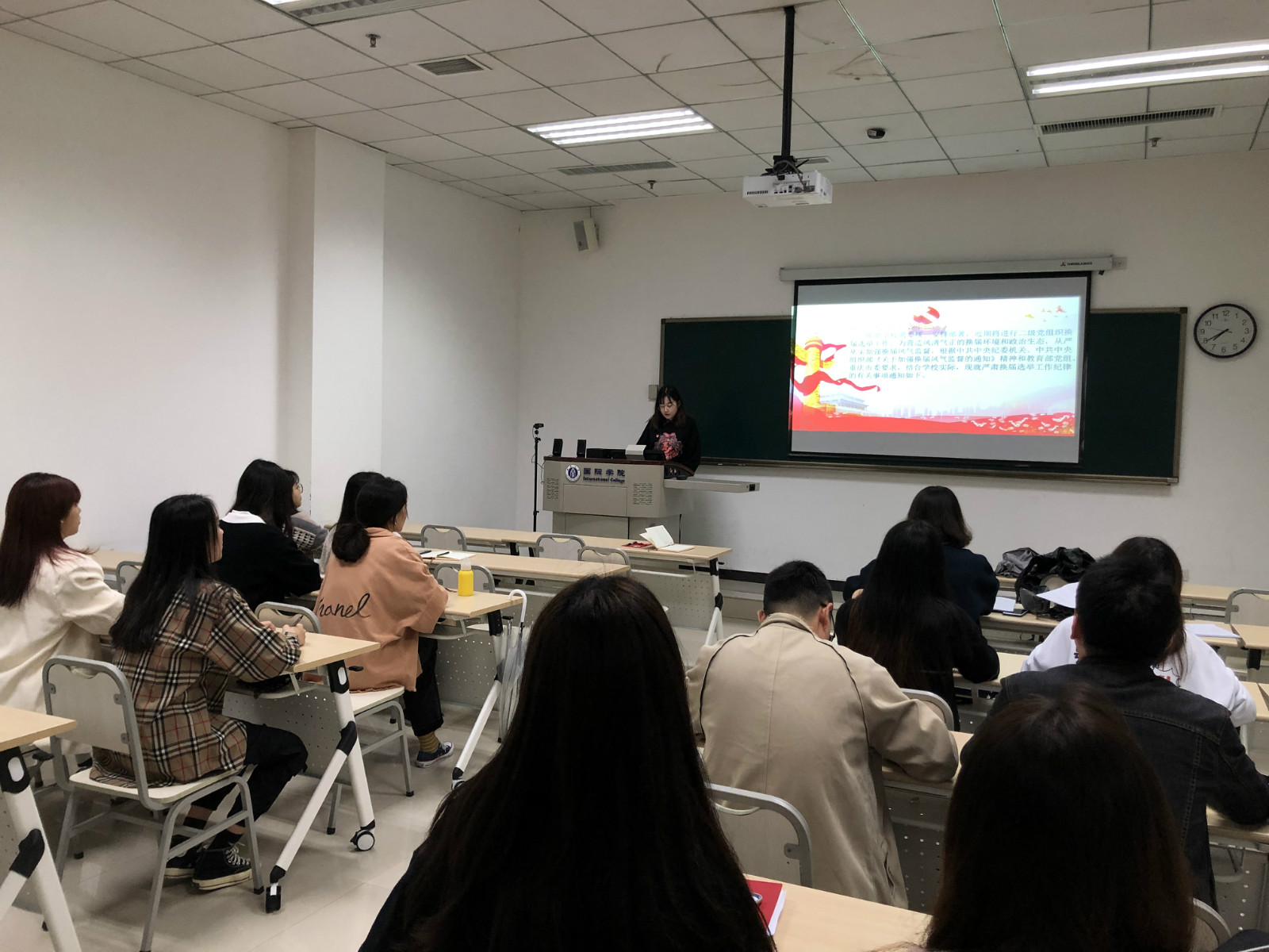 汪鑫阳同志带领全体党员集中学习了《中国共产党基层组织选举工作条例》及学校相关文件要求,观看了《警钟》等警示教育片并介绍了二级党组织换届选举工作的有关情况,明确了学校党支部的职数设置以及选举流程和相关要求,强调了本次换届选举的重要性和严肃性,要求每位学生党员同志要高度重视,认真学习选举流程以及相关准备工作,在选举过程中做到“公平公正公开”。