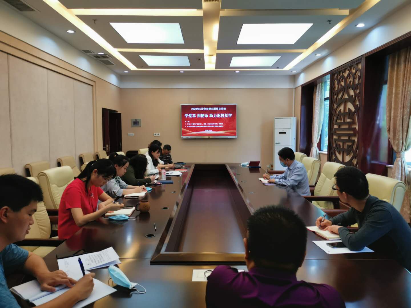 大家积极自学相关内容,为线上会议做足准备。会议包括以下议程:1.支部书记王湛明同志讲授党课,组织大家重温《中国共产党章程》;2.每位党员依次结合自学内容从“如何自觉践行党章,如何忠诚履行使命”谈责任担当;3.为五月入党的党员同志过政治生日。