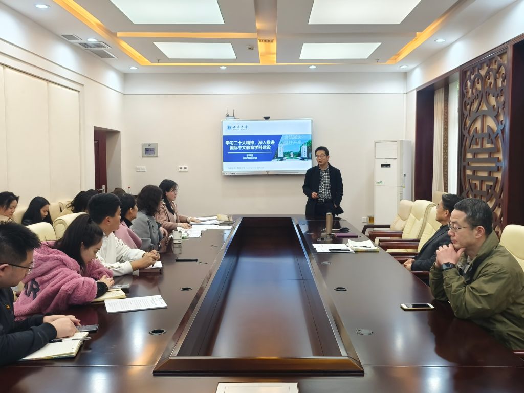 3月17日下午15时,学院党委在紫云楼签约室召开理论学习中心组(扩大)学习会议,于泽元院长作《学习二十大精神,深入推进国际中文教育学科建设》主题报告。会议由刘猛书记主持,学院党委委员、支部书记、各科室主任和教职工参加学习会。