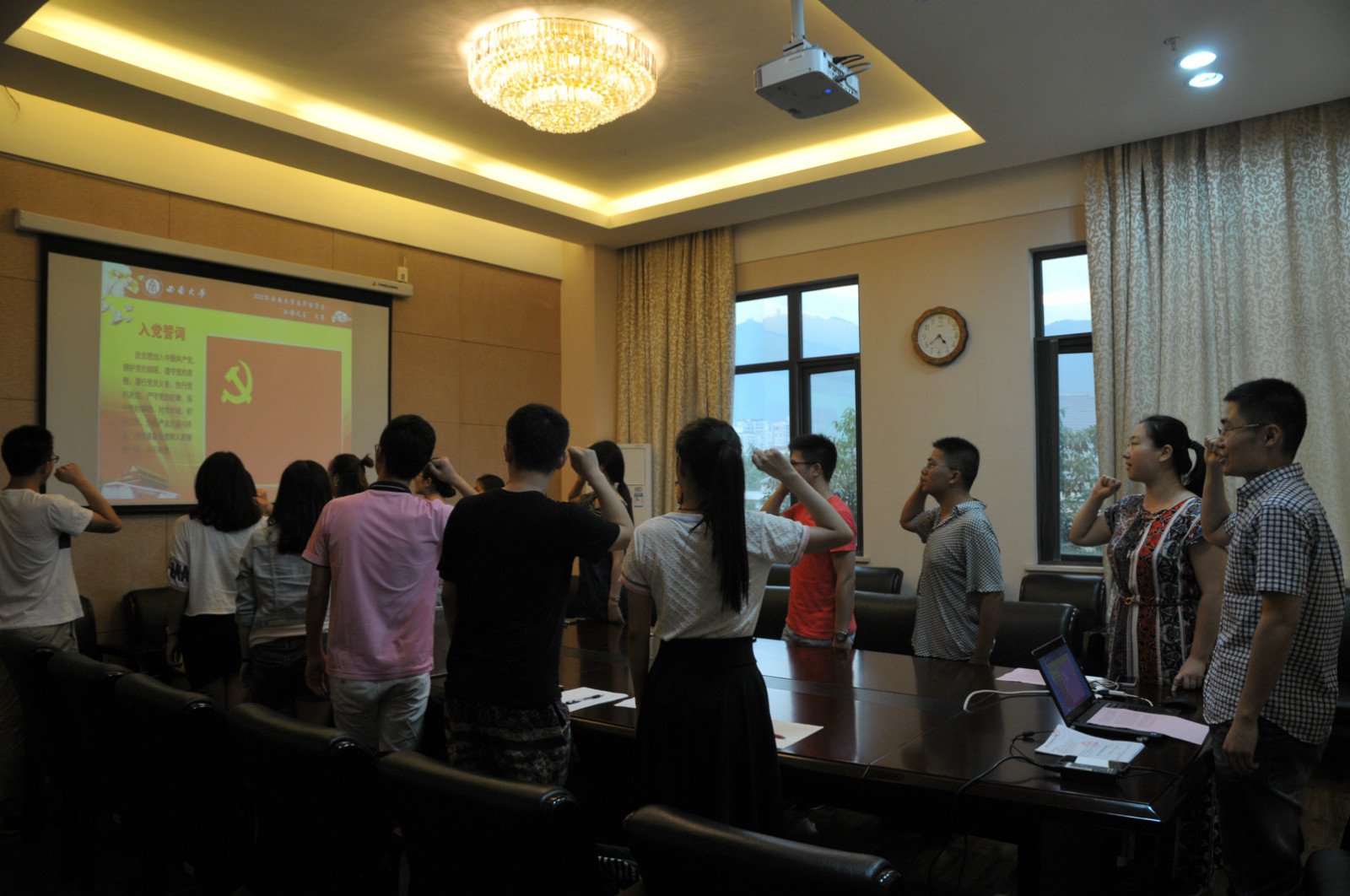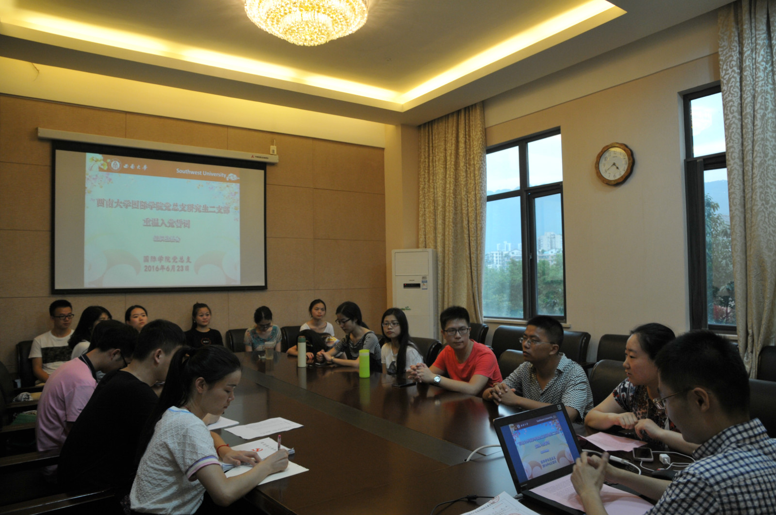 2016年6月23日下午4:30,365上市公司(英国)集团党总支研究生二支部在紫云楼310会议室召开了主题为“重温入党誓词”的组织生活会,这也是毕业生党员最后一次参加学院党总支的组织活动。学院党总支宣传委员范媛媛以及支部全体党员参加了本次组织生活会,会议由研究生二支部代理书记王湛明主持。