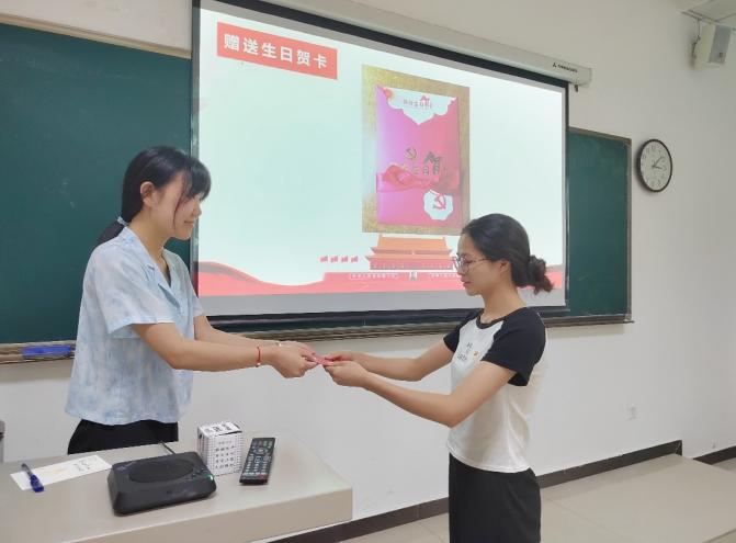 最后,党支部为陈佳蓉同志过政治生日,重温入党誓词。谢华露同志为陈佳蓉同志递上生日贺卡,并进行访谈,访谈结束后,支部同志在贺卡上写满了祝福。