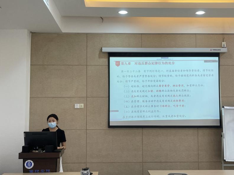 曾仪君同志领学习近平总书记《论党的自我革命》篇目——《严明党的组织纪律》,强调了党的领导体现在党的严密组织体系和强大组织能力上,从五个方面强调了遵守党的组织纪律的重要性。程若曦同志领学《中国共产党纪律处分条例》第九章至第十一章,向各位同志介绍了对违反群众纪律行为、工作纪律行为、生活纪律行为的处分,帮助支部同志与积极分子强化了组织纪律意识。