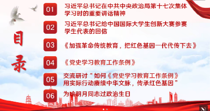 郑晓婷同志带领全体党员共同学习了《习近平总书记在中共中央政治局第十七次集体学习时的重要讲话精神》。胡艳琳同志领学《习近平总书记给中国国际大学生创新大赛参赛学生代表的回信》以及习近平同志《论教育》中的《加强革命传统教育,把红色基因一代代传下去》。党员们纷纷表示,要牢记习近平总书记的嘱托,不断提升自己的创新能力和综合素质;要自觉传承红色基因,弘扬革命精神,为实现中华民族伟大复兴的中国梦贡献自己的力量。