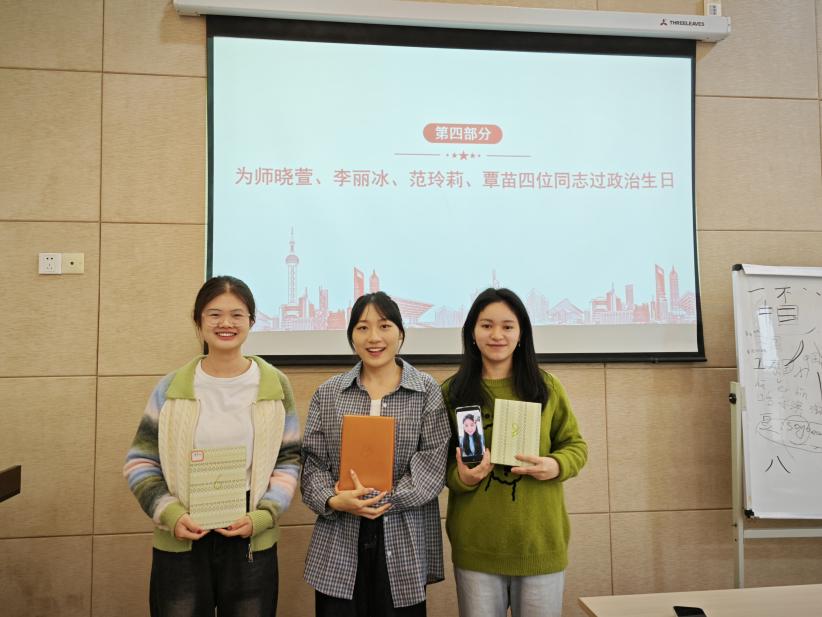 支部为11月入党的范玲莉、师晓萱、李丽冰、覃苗四位党员同志庆祝政治生日,她们依次发表了党员心声,回顾了自己入党的心路历程及成长经历,表达了对党组织的热爱与感激之情。